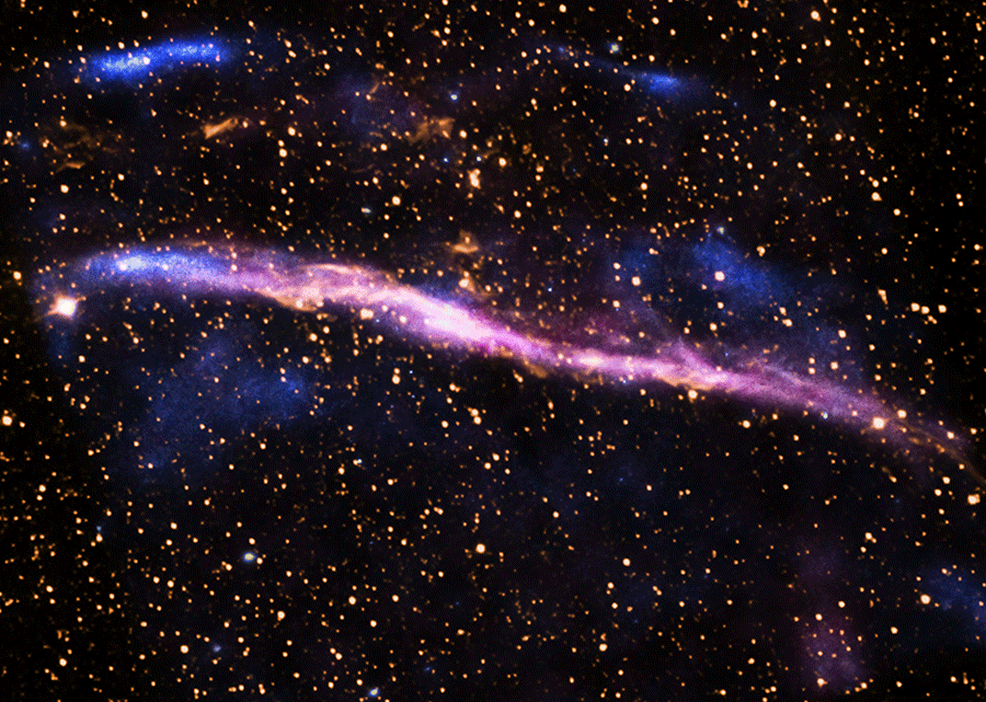 This supernova remnant is the remains of an exploded star that may have been witnessed by Chinese astronomers almost 2,000 years ago. Modern telescopes have the advantage of observing this object in light that is completely invisible to the unaided human eye. This image combines X-rays from Chandra (pink and blue) along with visible emission from hydrogen atoms in the rim of the remnant, observed with the 0.9-m Curtis Schmidt telescope at the Cerro Tololo Inter-American Observatory (yellow). (Credit: X-ray: NASA/CXC/MIT/D.Castro et al, Optical: NOAO/AURA/NSF/CTIO)