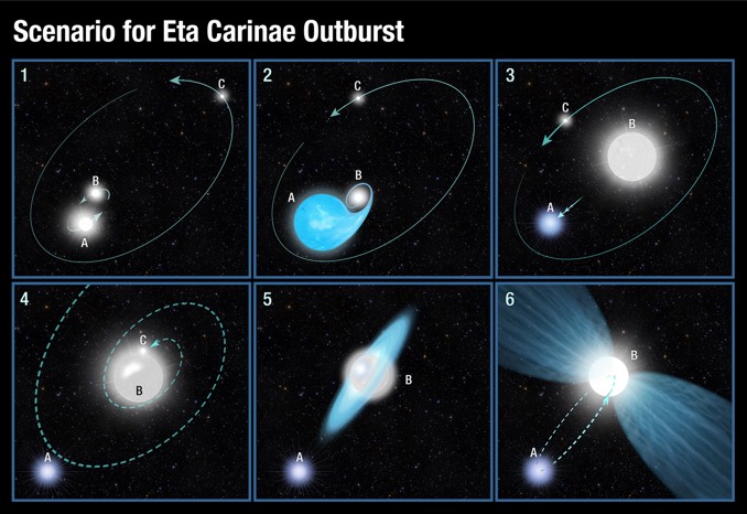 Smith and Armin argue Eta Carinae likely started out as a triple star system with two massive stars orbiting close together and a third star farther away. When the more massive of the two closely orbiting suns neared the end of its life, it began to expand, allowing the slightly less massive star to suck in an enormous amount of material.