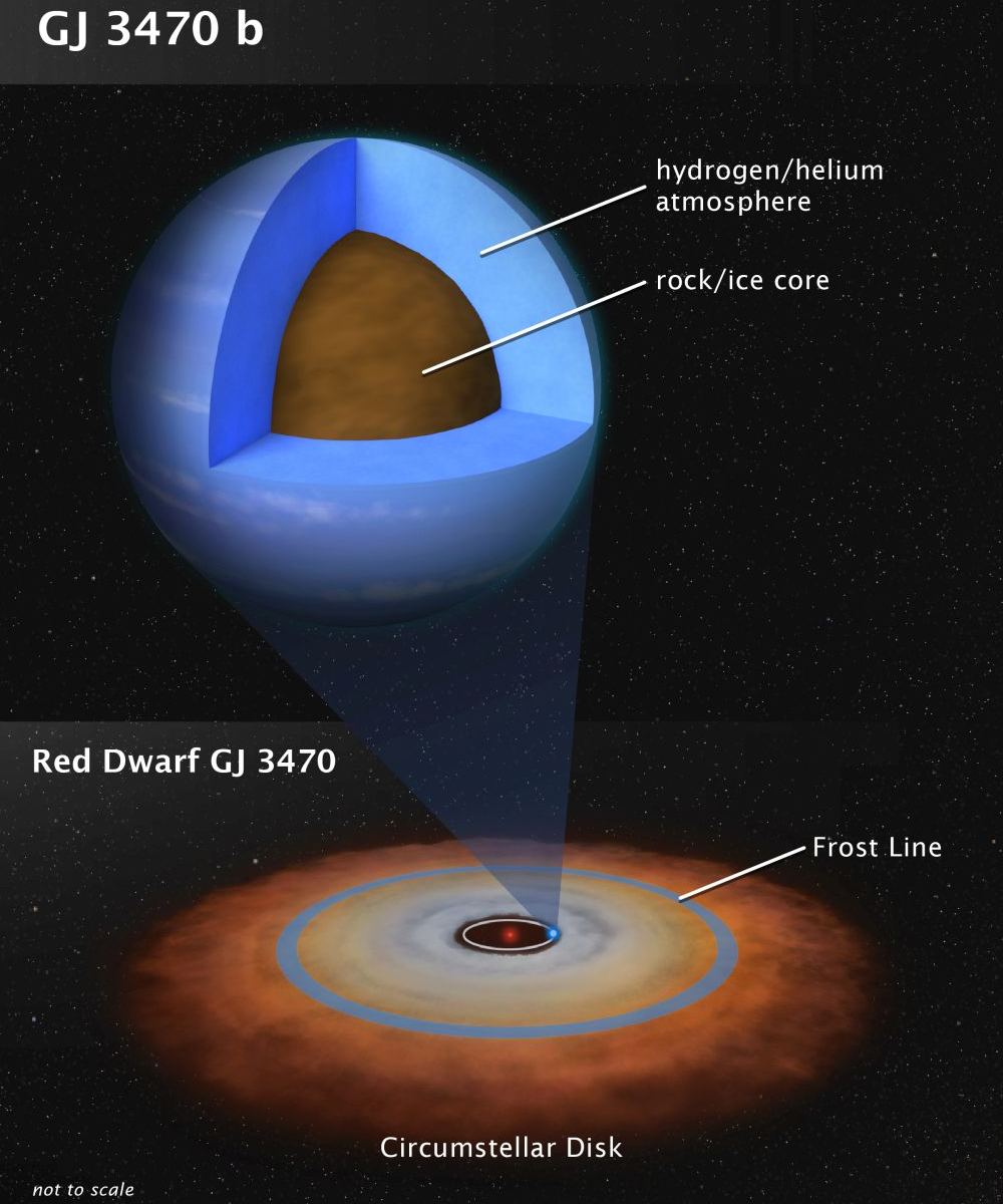 This artist’s illustration shows the theoretical internal structure of the exoplanet GJ 3470 b. It is unlike any planet found in the Solar System. Weighing in at 12.6 Earth masses the planet is more massive than Earth but less massive than Neptune. Unlike Neptune, which is 3 billion miles from the Sun, GJ 3470 b may have formed very close to its red dwarf star as a dry, rocky object. It then gravitationally pulled in hydrogen and helium gas from a circumstellar disk to build up a thick atmosphere. The disk dissipated many billions of years ago, and the planet stopped growing. The bottom illustration shows the disk as the system may have looked long ago. Observation by NASA’s Hubble and Spitzer space telescopes have chemically analyzed the composition of GJ 3470 b’s very clear and deep atmosphere, yielding clues to the planet’s origin. Many planets of this mass exist in our galaxy. Image Credit: NASA, ESA, and L. Hustak (STScI)