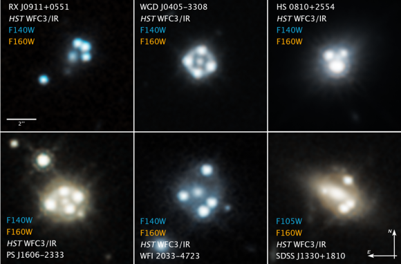 Long exposures made with the Hubble Space Telescope showing brilliant quasars flaring in the hearts of six distant galaxies.
