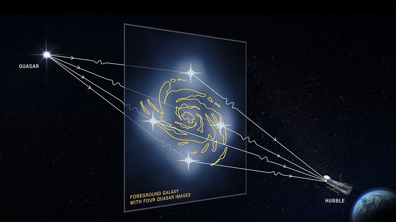 Hubble images of a background quasar and its host galaxy surrounding the central core of a foreground massive galaxy. Credit: NASA/ESA/A. Nierenberg (JPL)/T. Treu (UCLA)