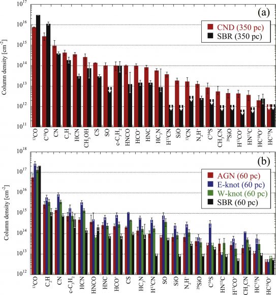 This figure from the study compares column densities of each molecule in (a) 350 pc scale and (b) 60 pc scale. The bar graphs in red, blue, green, and black are for the CND (or AGN), the E-knot, the W-knot, and the SBR, respectively. The order of molecules is arranged in descending order from left to right based on the column density toward CND in (a) or AGN in (b). Image Credit: Nakajima et al. 2023.