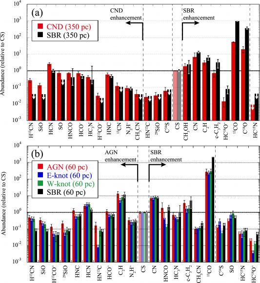 This figure from the research shows fractional abundances relative to CS in (a) the 350 pc scale and (b) the 60 pc scale. Ratios over unity, which is indicated by the bold dashed line, represent the enhancement of molecular abundances relative to CS. The order of the molecules is arranged in descending order from left to right based on the difference between the CND and the SBR for (a) and between the AGN and the SBR for (b). Therefore, the molecules on the left side of CS are enhancements in the CND (or AGN) compared with the SBR; in contrast, those on the right side of CS are enhancements in the SBR. Image Credit: Nakajima et al. 2023.