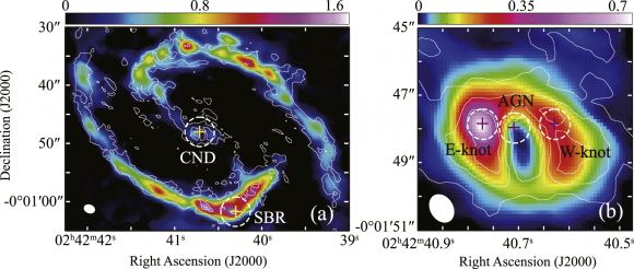 This figure from the research illustrates NGC 1068’s structure. The left panel shows both the CND and the SBR. The right panel is zoomed in on the CND and the active galactic nuclei and also shows both knots. Image Credit: Nakajima et al. 2023.