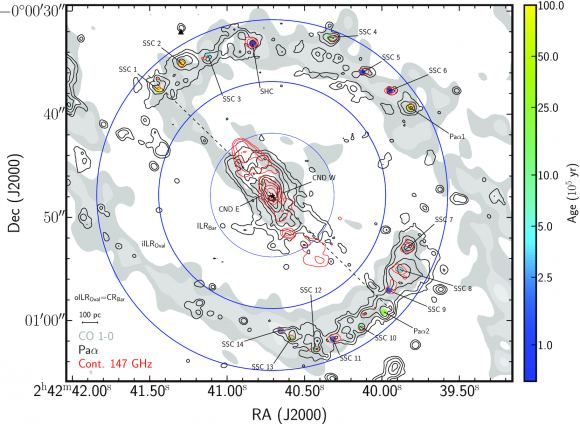 This figure is from separate research and shows NGC 1068’s structure. The starburst ring is between the two dark blue lines and contains many super star clusters (SSCs.) SSCs are more luminous and more massive than other clusters. Image Credit: Rico-Vallas et al. 2021