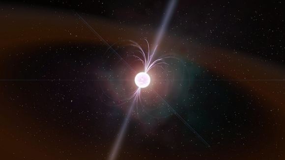 An artist’s conception of a neutron star shows a schematic of its magnetic field and possible jets of material escaping from the poles. In the Scorpius X-1 system, the neutron star is paired with a low-mass star. Material escapes from the smaller star onto the surface of the neutron star. irregularities in the surface of the neutron star may play a role in creating gravitational waves.Credit: Kevin Gill, Attribution 2.0 Generic (CC BY 2.0)
