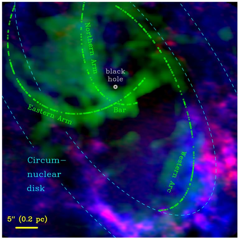 The Milky Way’s supermassive black hole, called Sagittarius A* (or Sgr A*), is arrowed in the image made of the innermost galactic center in X-ray light by NASA’s Chandra Observatory. To the left or east of Sgr A* is Sgr A East, a large cloud that may be the remnant of a supernova. Centered on Sgr A* is a spiral shaped group of gas streamers that might be falling onto the hole. Credit: NASA/CXC/MIT/Frederick K. Baganoff et al.
