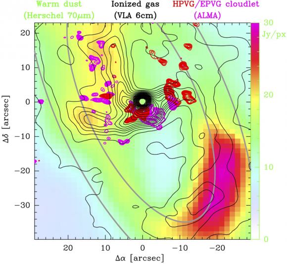 As matter falls toward the supermassive black hole at the galaxy’s center, some of it is accelerated outward at nearly