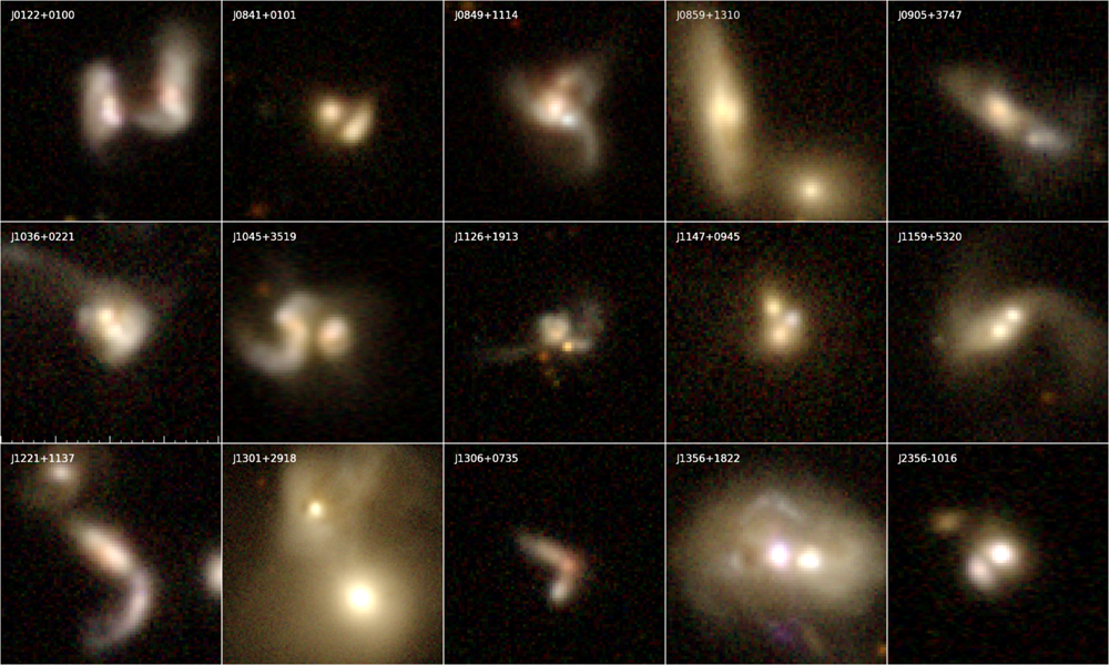 These 15 images from the Sloan Digital Sky Survey show merging pairs of galaxies. A supermassive black hole lies in the brightest portion of each galaxy: its nucleus. Within this sample, astronomers have identified several pairs and two trios of actively feeding black holes. Pfeifle et al., ApJ, Volume 875, Issue 2, i.d. 117, 2019 Astronomers know that nearly all large galaxies host a supermassive black hole millions or billions times the mass of our Sun in their center. Some, like the monster in the middle of the Milky Way, are quiescent, feeding from only sparse clouds of gas and dust in a small region of space around them. But some are active, sucking down vast wells of material. These active galactic nuclei, or AGN, are common throughout the universe, and astronomers have just found more — but this new set is special. On June 28 2019, Ryan Pfeifle of George Mason University presented a set of eight previously unknown dual or triple AGN at the annual meeting of the European Astronomical Society. These are merging galaxies in which the supermassive black holes in each of the participating galaxies are all actively feeding on material from their surroundings. Pfeifle’s team found these pairs and trios using data from NASA’s Wide-Field Infrared Survey Explorer (WISE) telescope and Chandra X-ray Observatory, as well as the European Space Agency’s XMM-Newton X-ray telescope. Their work was published earlier this year in the April 23 edition of The Astrophysical Journal.
