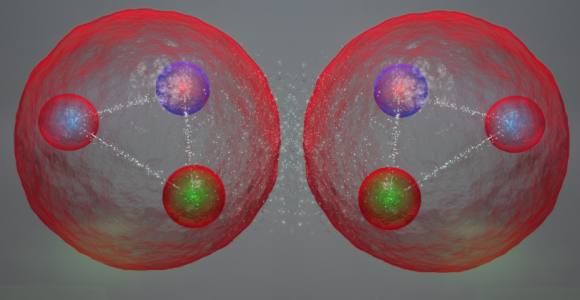 Artist’s impression of two baryons, composed of three quarks each, that combine to form a hexaquark. Credit: University of Edinburgh