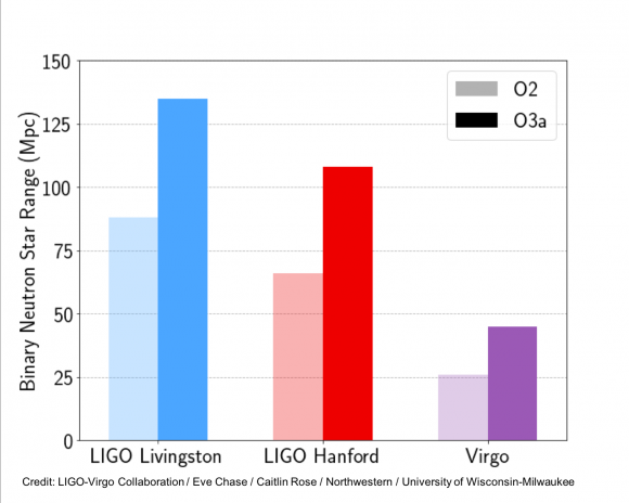 Graphic showing the how far away some of the events for each observatory were. O2 is the second observing period, whereas O3a is the first part of the third observing period. Credit: LIGO-Virgo Collaboration / Eve Chase / Caitlin Rose / Northwestern / University of Wisconsin-Milwaukee.