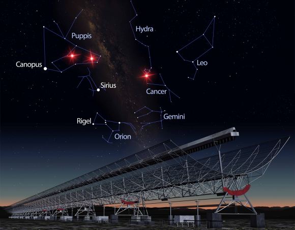 An illustration of fast radio bursts in the night sky above CHIMES, the Canadian Hydrogen Intensity Mapping Experiment. Credit: James Josephides/Mike Dalley