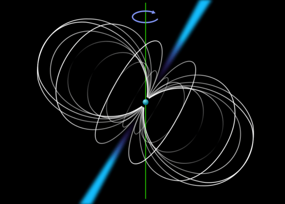 A pulsar with its magnetic field lines illustrated. The beams emitting from the poles are what washes over our detectors as the dead star spins. Credit: NASA/Fermi/Cruz de Wilde