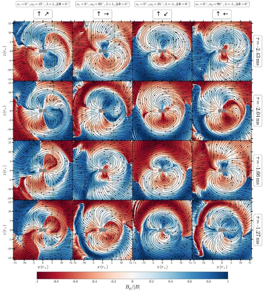 *Explaining everything in this figure would mean plunging deeply into a rabbit hole, but it's basically showing how different alignments of the pair of neutron stars affects the magnetic fields. Above each column is a box with two arrows, illustrating different alignment configurations simulated in the work. Each row represents a different time in the merger, as indicated in a box on the right of each row. The complicated entwined magnetic fields are clear to see. Image Credit: D. Skiathas et al. 2025. ApJ*