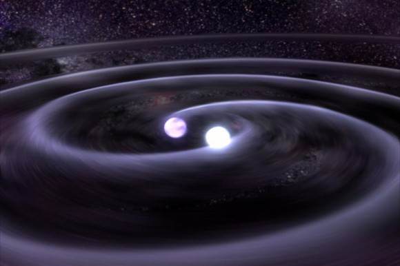 Artist impression and animation of the Shapiro Delay. As the neutron star sends a steady pulse towards the Earth, the passage of its companion white dwarf star warps the space surrounding it, creating the subtle delay in the pulse signal. Credit: BSaxton, NRAO/AUI/NSF