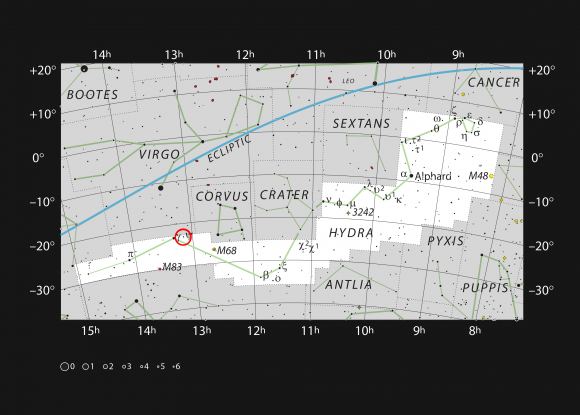 This chart shows the sprawling constellation of Hydra (The Female Sea Serpent), the largest and longest constellation in the sky. Most stars visible to the naked eye on a clear dark night are shown. The red circle marks the position of the galaxy NGC 4993, which became famous in August 2017 as the site of the first gravitational wave source that was also identified in light visible light as the kilonova GW170817. NGC 4993 can be seen as a very faint patch with a larger amateur telescope. Image Credit: ESO, IAU and Sky & Telescope