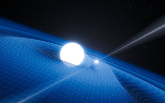 Artist’s illustration of two merging neutron stars. The narrow beams represent the gamma-ray burst while the rippling spacetime grid indicates the isotropic gravitational waves that characterize the merger. Swirling clouds of material ejected from the merging stars are a possible source of the light that was seen at lower energies. Credit: National Science Foundation/LIGO/Sonoma State University/A. Simonnet