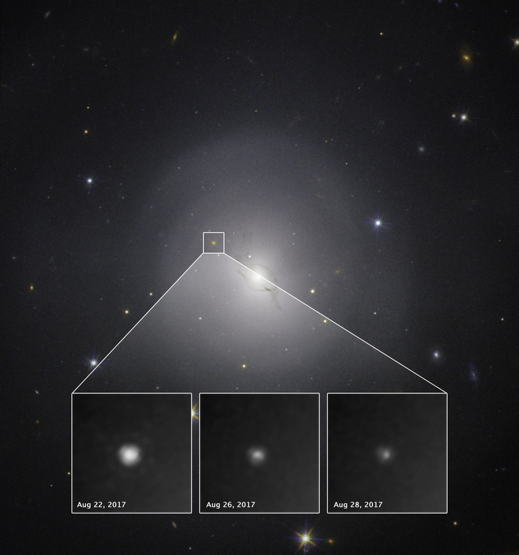 On 17 August 2017, the Laser Interferometer Gravitational-Wave Observatory (LIGO) and the Virgo Interferometer both detected gravitational waves from the collision between two neutron stars. Within 12 hours observatories had identified the source of the event within the lenticular galaxy NGC 4993, shown in this image gathered with the NASA/ESA Hubble Space Telescope. The associated stellar flare, a kilonova, is clearly visible in the Hubble observations. This is the first time the optical counterpart of a gravitational wave event was observed. Hubble observed the kilonova gradually fading over the course of six days, as shown in these observations taken in between 22 and 28 August (insets). By ESA/Hubble, CC BY 4.0, Wikipedia location