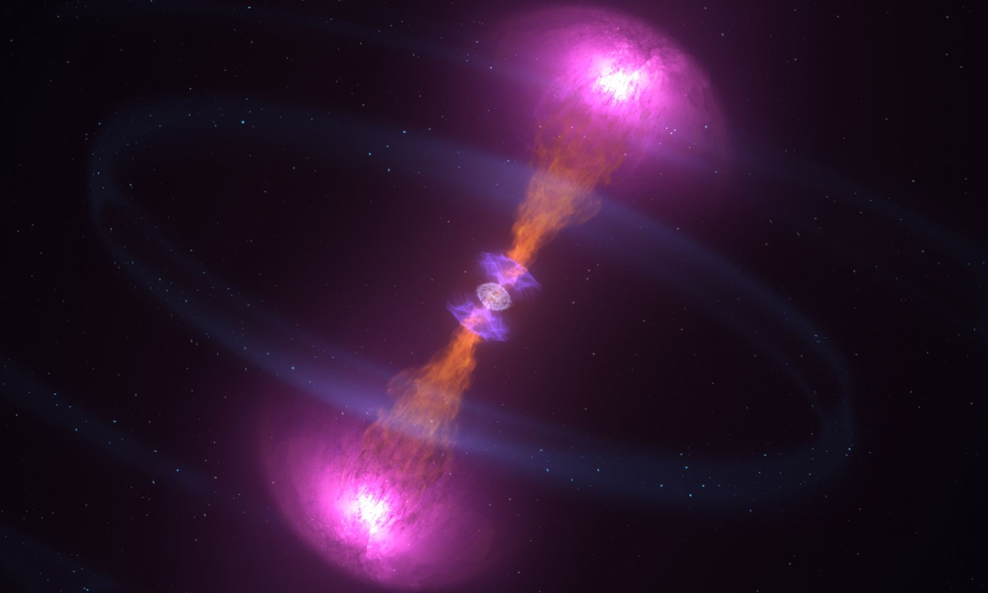 Artist's illustration of a bright gamma-ray burst occurring in a star-forming region and beaming out energy into two narrow, oppositely directed jets. Image Credit: By NASA/Swift/Mary Pat Hrybyk-Keith and John Jones - [1]Transferred from en.wikipedia to Commons by TheDJ using CommonsHelper. Public Domain, - Wikipedia