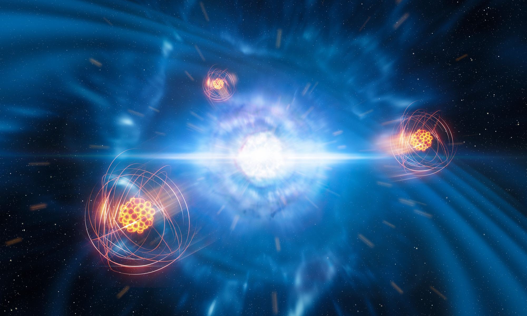 In 2019 a team of European researchers, using data from the X-shooter instrument on ESO’s Very Large Telescope, found signatures of strontium formed in the GW170817 neutron-star merger. This artist’s impression shows two tiny but dense neutron stars when they merge and explode as a kilonova. In the foreground, we see a representation of freshly created strontium. Image Credit: ESO/L. Calçada/M. Kornmesser