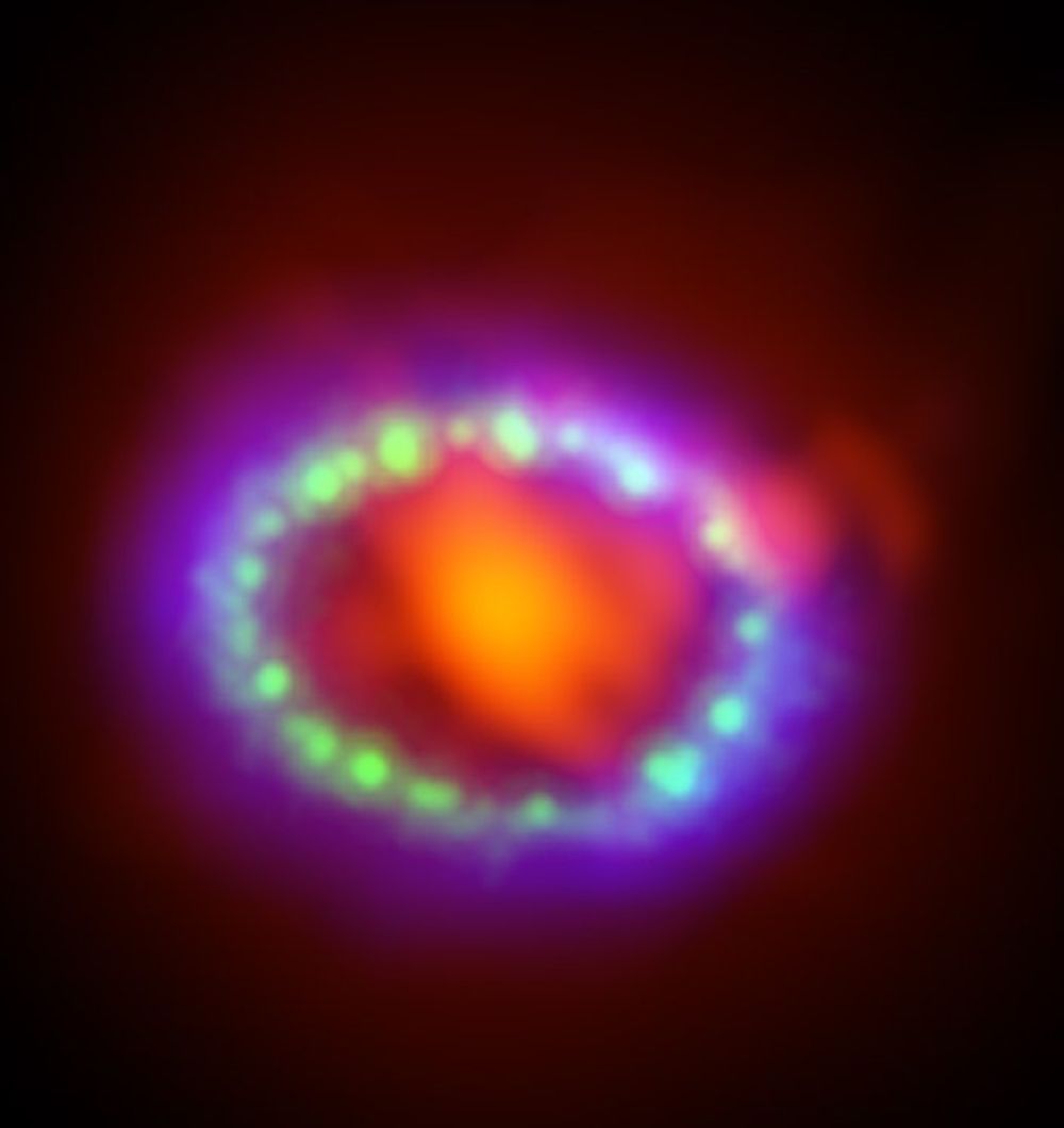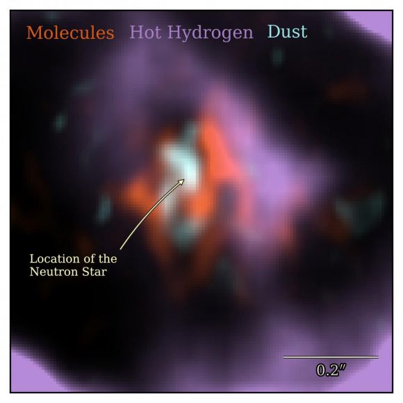 A close-up view of different components in the SN 1987A system: carbon monoxide molecular gas is shown in orange, hot hydrogen gas is shown in purple, and the dust which surrounds the neutron star is shown in cyan. Credit Cardiff University