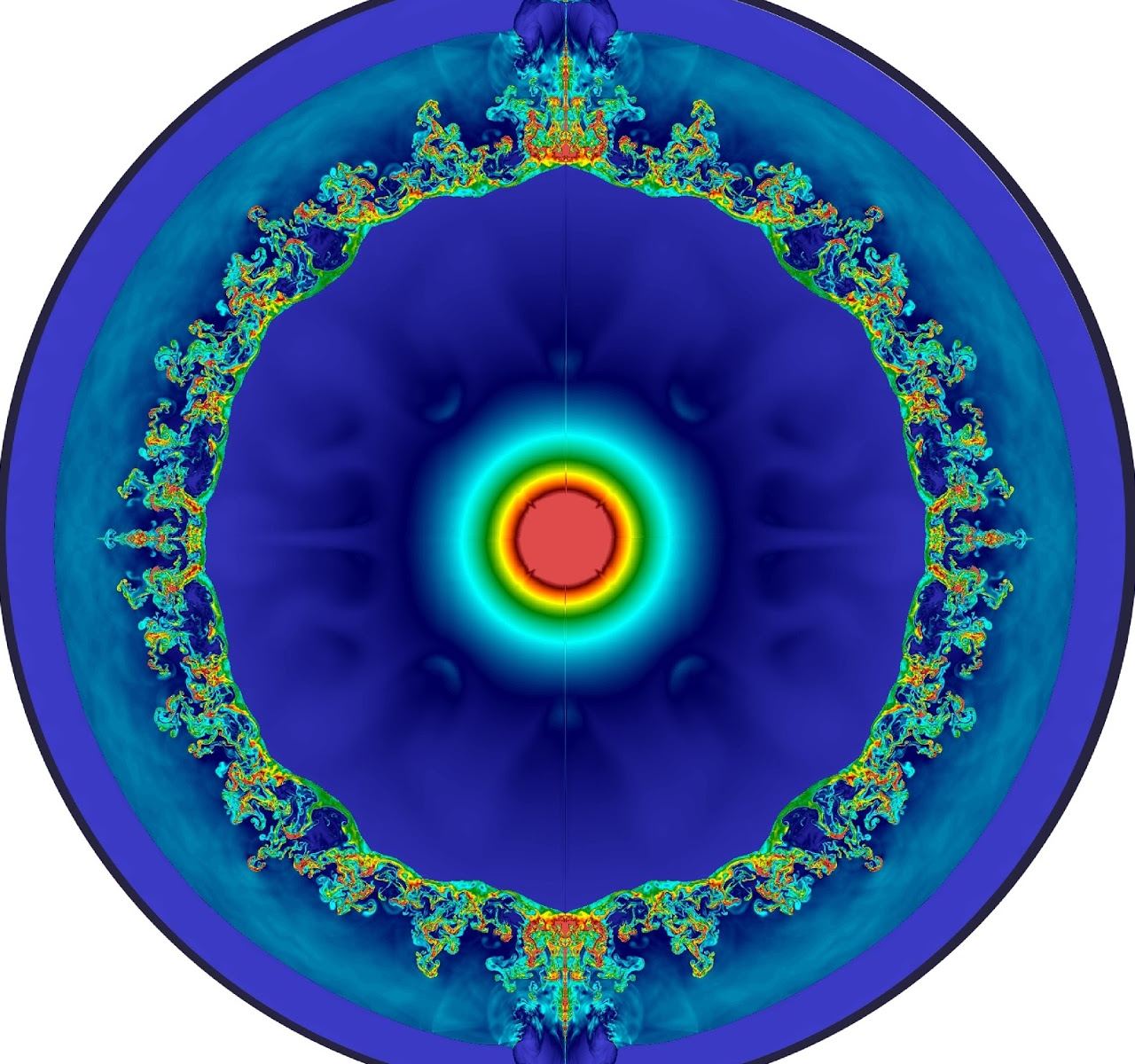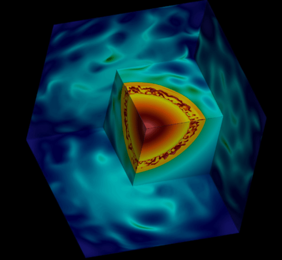 A 3-D profile of a pair-instability supernovae. The blue cube shows the entire simulated space. Orange region is where nickel 56 decays. Image Credit: ASIAA/Ken Chen