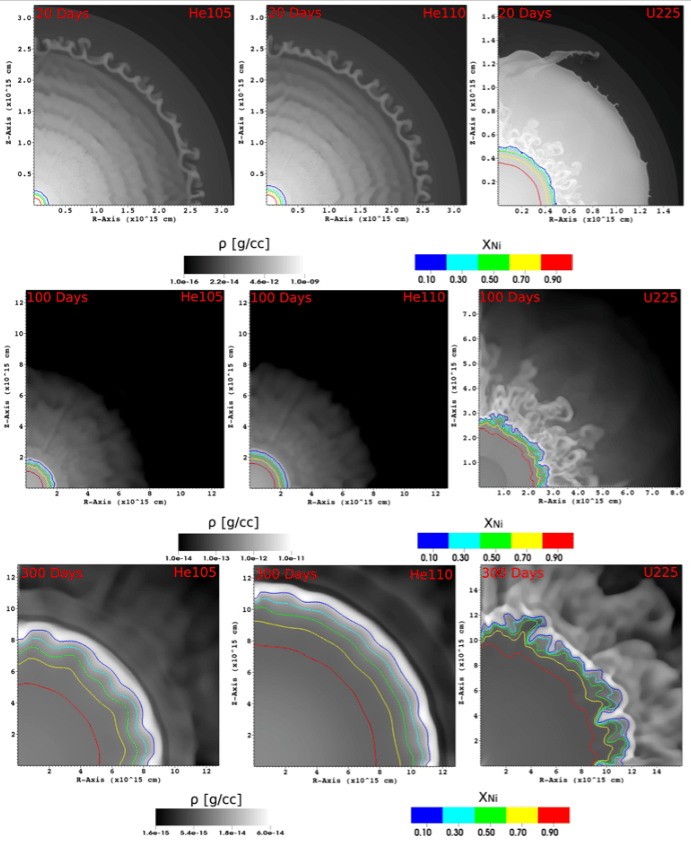 A figure from the study. The team simulated three types of hypernovae, represented by the three columns. The rows are snapshots from the simulation at 20, 100, and 300 days. The red line in each image represents the shell of the hot Ni-56 bubble. The simulations showed that the expansion of the Ni-56 bubble doesn’t cause any mixing. The mixing in the U225 progenitor star, far right, is due to instabilities from the reverse shock. Image Credit: Chen et al, 202