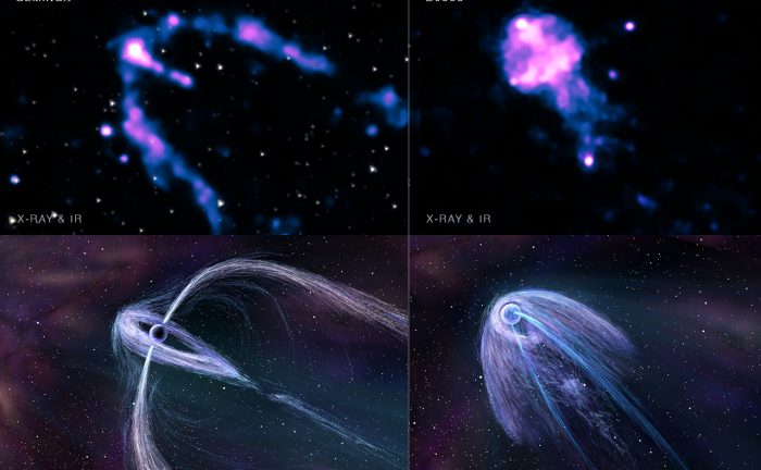 Four-panel graphic showing the two pulsars, Geminga (upper left) and B0355+54 (upper right), observed by Chandra. Credit: NASA/JPL-Caltech/CXC/PSU/B.Posselt et al/N.Klingler et al/Nahks TrEhnl