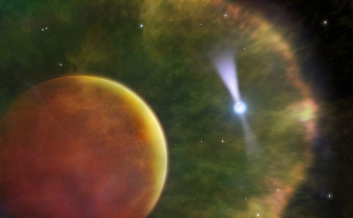 Artist’s impression of the pulsar PSR B1957+20 (seen in the background) through the cloud of gas enveloping its brown dwarf star companion. Credit: Dr. Mark A. Garlick; Dunlap Institute for Astronomy & Astrophysics, University of Toronto