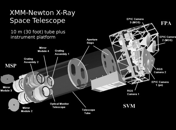 A diagram of the ESA XMM-Newton X-Ray Telescope. Delivered to orbit by a Ariane 5 launch vehicle in 1999. Credit: ESA/XMM-Newton