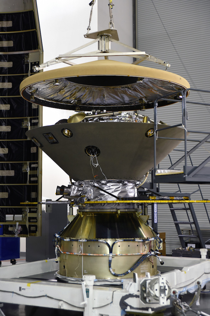 These photos show InSight’s heat shield, measuring around 8.7 feet (2.6 meters) in diameter, being lifted onto the spacecraft’s back shell April 12 to enclose the lander for the trip to Mars. The heat shield and back shell will protect the probe during descent through the Martian atmosphere.