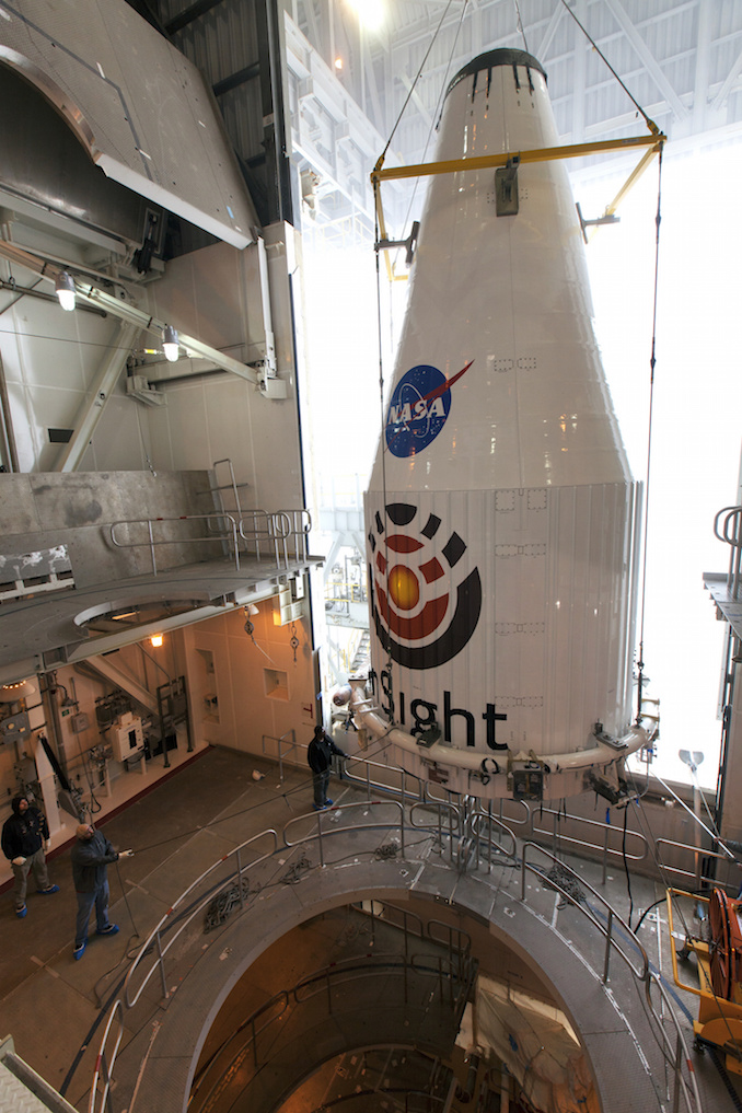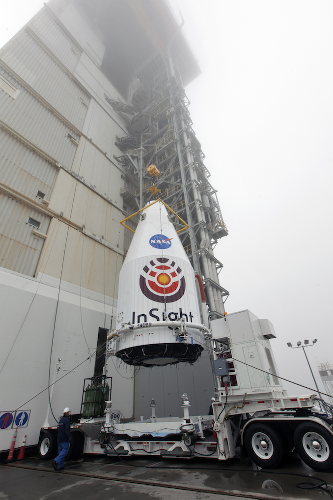InSight and its payload fairing were transported from a payload processing clean room to Space Launch Complex 3-East at Vandenberg on April 23. A crane hoisted the payload on top of the Atlas 5 rocket inside the launch pad’s mobile gantry, capping assembly of the 188-foot-tall (57-meter) launcher.