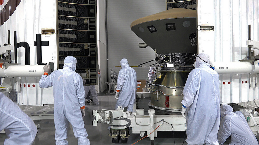Once fully assembled in its cruise configuration — with fixed solar array wings to provide electricity during the nearly seven-month journey to Mars — the 1,530-pound (694-kilogram) InSight spacecraft was encapsulated inside the Atlas 5 rocket’s payload fairing April 16.
