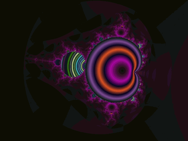 Zoom into a 3D rendering of the Mandelbrot set using a simple illumination method. The height outside the set is taken from the calculated distance estimate. c=0.2847753769449792+i*0.01115702382975