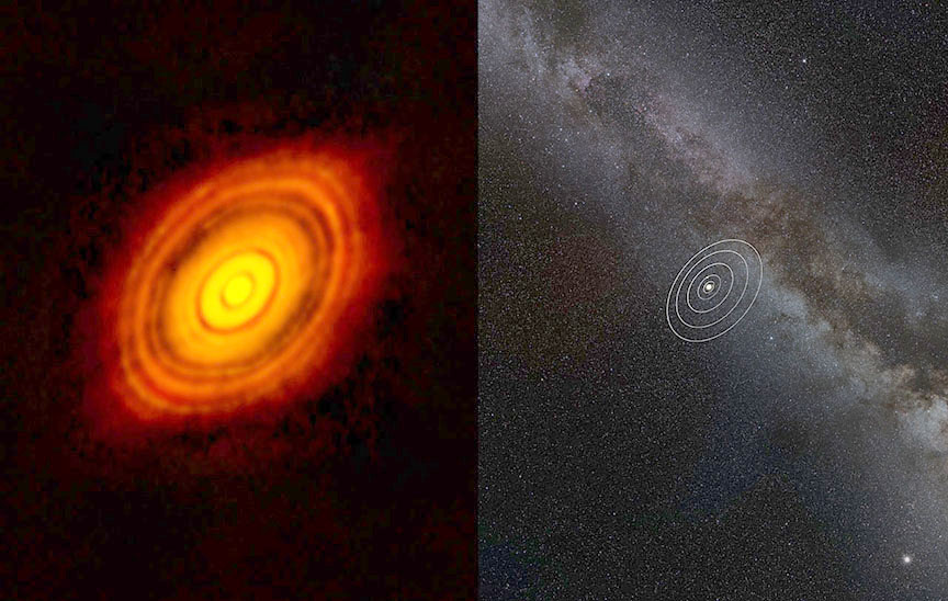 Click to enlarge. This artist’s impression depicts a rapidly spinning supermassive black hole surrounded by an accretion disc. This thin disc of rotating material consists of the leftovers of a Sun-like star which was ripped apart by the tidal forces of the black hole. Shocks in the colliding debris as well as heat generated in accretion led to a burst of light, resembling a supernova explosion. Image Credit: SO, ESA/Hubble, M. Kornmesser/N. Bartmann