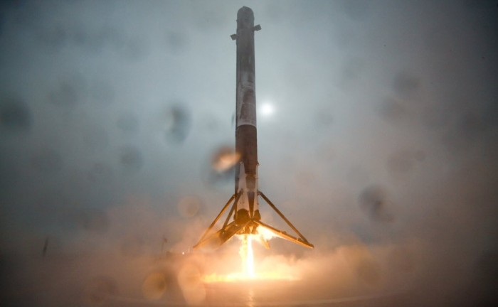 SpaceX Falcon 9 First stage approaches center of landing droneship in Pacific Ocean. Credit: SpaceX