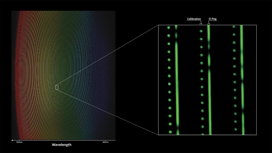 Image: The left side of this image shows light from the star 51 Pegasi spread out into a spectrum that reveals distinct wavelengths. The right-hand section shows a zoomed-in view of three wavelength lines from the star. Gaps in the lines indicate the presence of specific chemical elements in the star. Credit: Guðmundur Kári Stefánsson/Princeton University/NSF’s National Optical-Infrared Astronomy Research Laboratory/KPNO/NSF/AURA.
