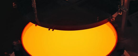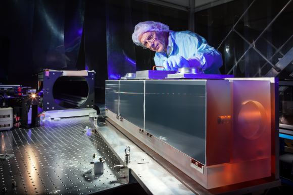 The huge diffraction grating is at the heart of the ultra-precise ESPRESSO spectrograph. In this image, the diffraction grating is undergoing testing in the cleanroom at ESO Headquarters in Garching bei München, Germany. Image: ESO/M. Zamani