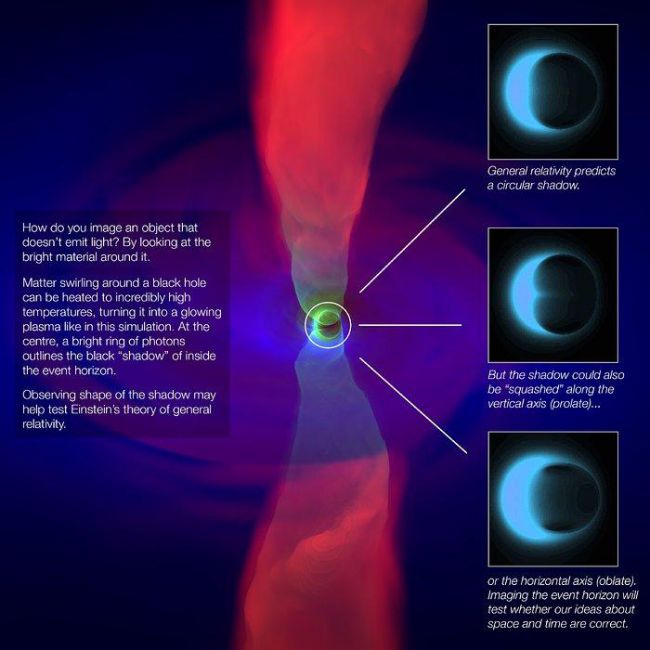 This infographic shows a simulation of the outflow (bright red) from a black hole and the accretion disk around it, with simulated images of the three potential shapes of the event horizon's shadow. CREDIT (Image: © ESO/N. Bartmann/A. Broderick/C.K. Chan/D. Psaltis/F. Ozel)