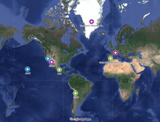 The Event Horizon Telescope network, mapped on GoogleMaps with data from NASA and TerraMetrics. Watch a livestreamed announcement of the Event Horizon Telescope's first results on April 10, 2019 at 9 a.m. EDT here.