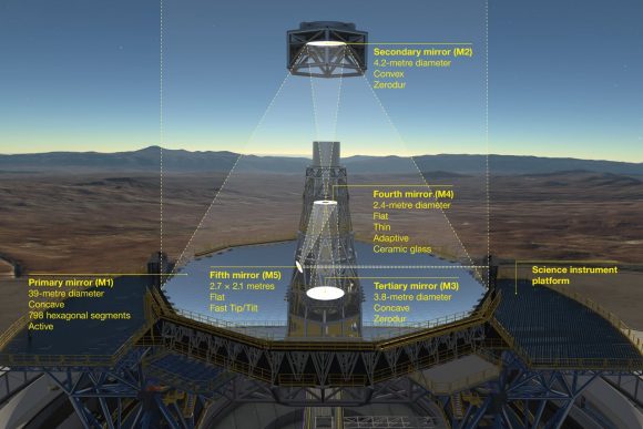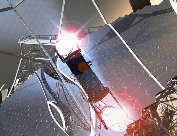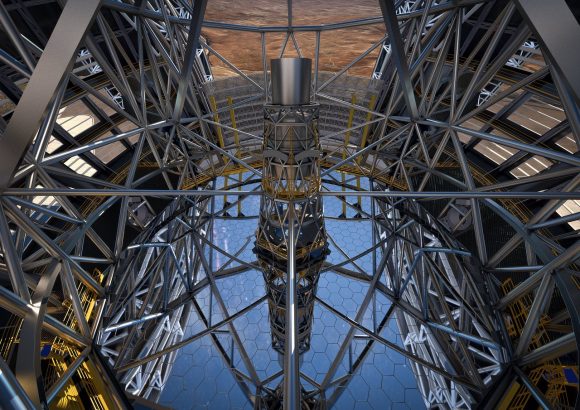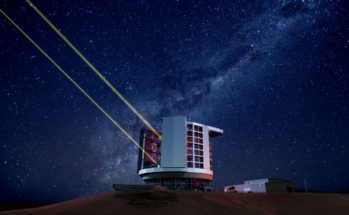 An artist’s illustration of the GMT in Chile. The seven-segment mirror is the heart of the telescope. Credit: Giant Magellan Telescope – GMTO Corporation