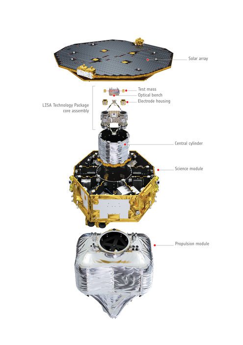 This exploded view shows the LISA Pathfinder spacecraft in its entirety. The white- and gold-hued science module carries