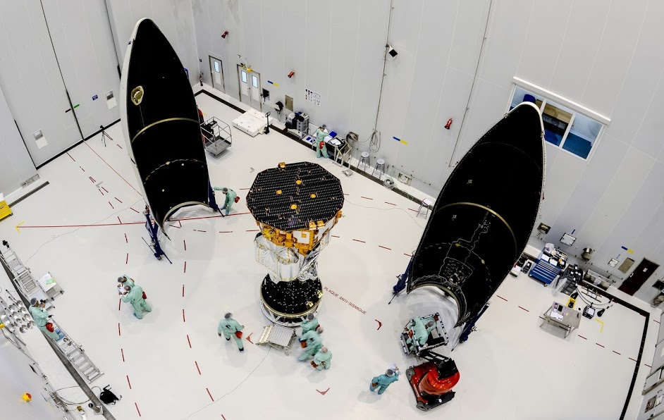 LISA Pathfinder is being encapsulated within the half-shells of the Vega rocket fairing on November 16, 2015, at the Centre Spatial Guyanais in Kourou, French Guiana. LISA Pathfinder will test the fundamental technologies and instrumentation needed for such an observatory, demonstrating them for the first time in space. LISA Pathfinder is currently scheduled for launch with Arianespace flight VV06—the sixth launch of Europe's small Vega ...