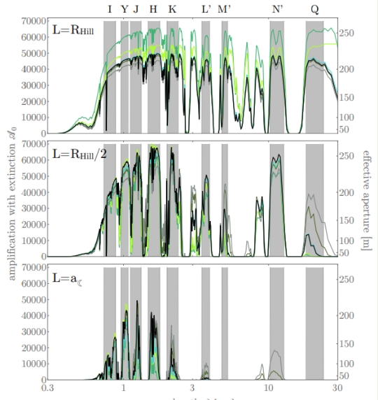 Image: This is Figure 11 from the paper. Caption: Amplification after extinction expected for a 1 metre diameter telescope at the Earth’s Hill radius (top), half the Hill radius (middle) and the Moon’s separation (bottom). Six atmosphere models are shown… [the color coding is provided in the paper, q.v.], which control temperature-pressure profiles (and thus refractivity profile) as well as the extinction computed using lowtran7 [a propagation model and computer code for predicting atmospheric transmittance and sky thermal and scattered radiance]. All models assume no clouds. Standard photometric filters highlighted in gray, except for L, M and N which are slightly offset to encompass the optimal regions. Credit: David Kipping.