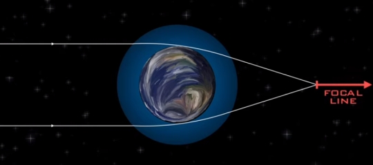Image: Light from a distant star is deflected by the atmosphere of the Earth by half a degree. After skimming the surface, it is bent again as it exits the atmosphere by one-half a degree. Light entering the opposite hemisphere does the same, creating a focal point. Rays entering the atmosphere higher up bend less because the atmosphere is thinner with altitude, so the result is a focal line. The trick is knowing which light can be effectively sampled. Image credit: David Kipping.