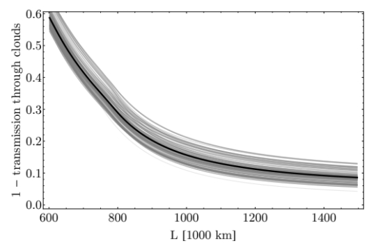 Image: This is Figure 13 from the paper. Estimated transmission through the Earth’s atmosphere due to clouds for a Terrascope detector at a distance L. At one Hill radius (1,500,000 km), lensed rays travel no deeper than 13.7 km and thus largely avoid clouds, thereby losing less than 10% of the lensed light. Credit: David Kipping.