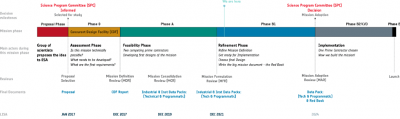 The mission timeline for LISA – including the milestones it has to hit on its way to launch. Credit – ESA