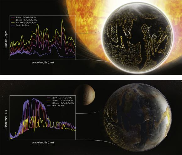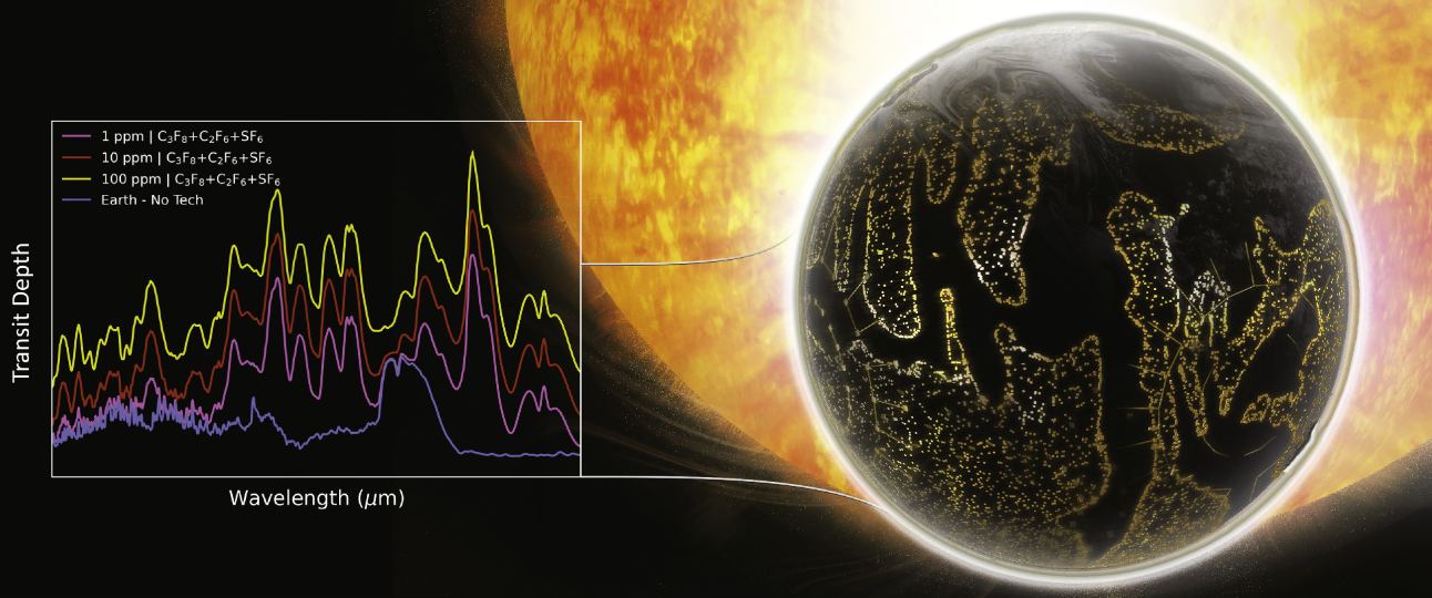 This concept figure illustrates a hypothetical Earth-like inhabited planet terraformed with various combined abundances of artificial greenhouse gases C3F8, C2F6, and SF6 and its resulting qualitative MIR transmission (top) and emission (bottom) spectra. Image Credit: Sohail Wasif, UC Riverside/Schwieterman et al. 2024.