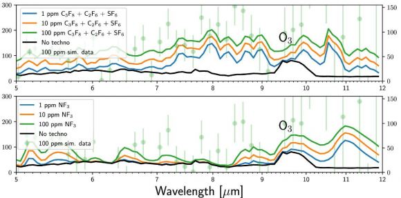 These figures show some of the simulation transmission spectra from the research. The top panel shows how different concentrations of three of the GHGs show up in MIR spectrometry for a simulated Earth-like TRAPPIST 1-f planet. The bottom panel shows how different concentrations of NF3 show up. O3 is shown because it shows up in the same band. The black line is the atmospheric spectrum without the GHGs. The 100 ppm results are from observing the planet for 10 transits. Image Credit: Schwieterman et al. 2024.