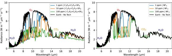 These figures show some of the simulated emission spectra for the GHGs compared to Earth with no technosignatures. They also show some of the technosignatures at different PPM concentrations and Earth’s O3, CO2, and H20. The spectra are different than the transmission spectra. Image Credit: Schwieterman et al. 2024.